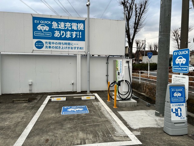 ダイヘン製50kw急速充電器が敷地内北西角 国道254号沿いに設置されていました。e-Mobility Power系カード、エコQ電で利用できます。エコQ電の場合は40円/分〜の料金体系です。