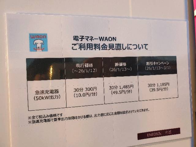 [急速充電器] 2023/09/14よりeMPスポットとして運用。 【ビジター料金やeMP未加盟充電器の情報等】 認証システム:ENEOS Charge Plus [急速充電器] ◆ENEOS Charge Plus認証の場合 ENEOS Charge Plus:1分/46.2円 (会員) ENEOS Charge Plus:1分/49.5円 (非会員) EneKey、WAON、クレジットカード支払いも可能。