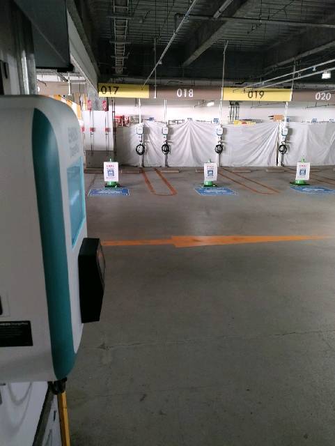3階をぐるっと回り、3階出口の手前を右に曲がったところにありました。 (3階をもう1周する方向です) コーンが設置されておらず、一般車も多数駐めていました。 地面にもEV200Vマークが書かれていなかったので気付きようがありません。 設置基数は多いですが、日によっては満車も覚悟したほうがいいかもしれません。