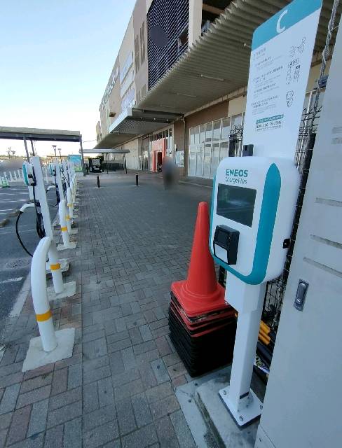 急速充電1/普通充電1の充電スペースにもカラーコーンが設置されていました。 一般の駐車枠と並列の充電スペースだと充電以外の車両が駐車してしまうこともありますので出庫の際は元の位置へお願いします。 ショッピングモールという場所柄、充電後放置しないよう気をつけてください。 「次」の利用者への配慮も忘れずに…。