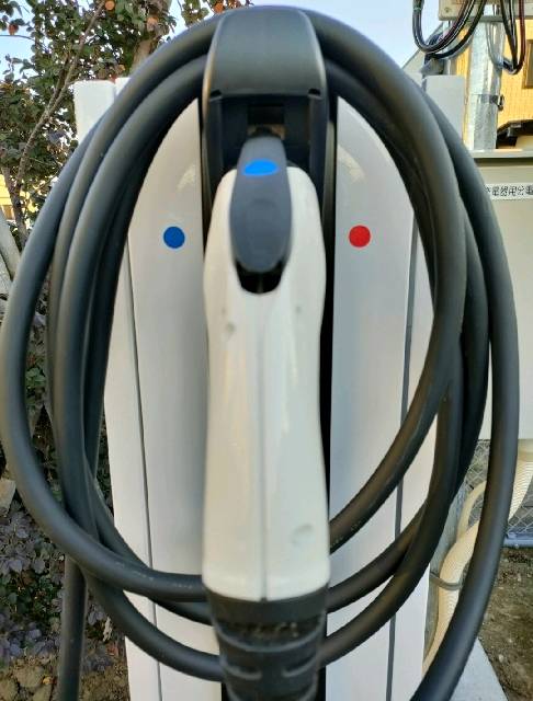 テラチャージ認証です(開庁時間内の稼働)。 充電器は日東工業製でした。 画像にある通り、シールの色で充電器とコネクターが判別できるようになっていました。