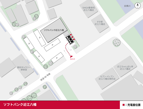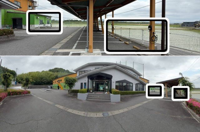 敷地に入って、右側の屋根の下に2つ左の緑の壁のところに2つあります。 間隔を開けて設置されてるので、充電できる写真は多いと思いますが、コーンの1つか2つは置いてほしいと感じました。