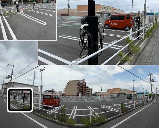 お店に向いて、左側の道路を挟んだ南側の駐車場のお店から遠目の南東側の角にあります。文書と写真追加 ここは充電器を端から設置しているので、少しもったいないかなと思いました、車が止まっている照明の両端ぐらいに間をあけておけば、より充電可能車室が増えそう、だとも思いました。が、 かなりお店から遠いところなので様子を見て、必要そうな数のコーンでの確保に期待したいところです。