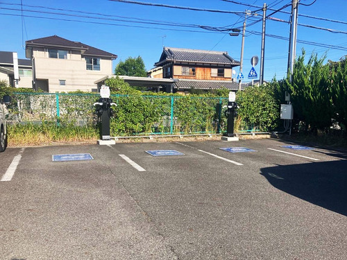 敷地に入って、右側の屋根の下に2つ左の緑の壁のところに2つあります。 間隔を開けて設置されてるので、充電できる写真は多いと思いますが、コーンの1つか2つは置いてほしいと感じました。