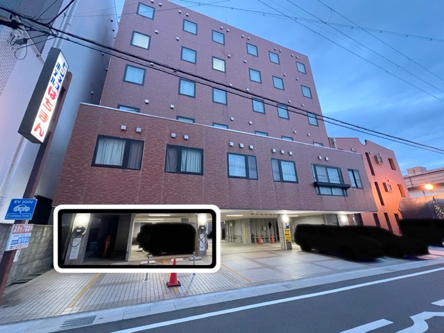 設置場所:ホテル駐車場出入口の左側の車室にEV充電器があります。 どなたでもご利用いただけます。 最大出力6kW