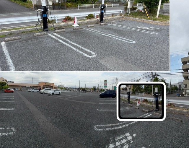 お店に向いて、左側の道路を挟んだ南側の駐車場のお店から遠目の南東側の角にあります。文書と写真追加 ここは充電器を端から設置しているので、少しもったいないかなと思いました、車が止まっている照明の両端ぐらいに間をあけておけば、より充電可能車室が増えそう、だとも思いました。が、 かなりお店から遠いところなので様子を見て、必要そうな数のコーンでの確保に期待したいところです。