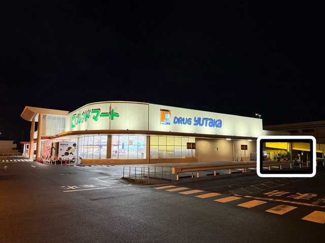 店舗建物に向かって右側。店舗と屋上駐車場へのスロープの間にあります。 「DRUG YUTAKA」の文字があるあたりです。