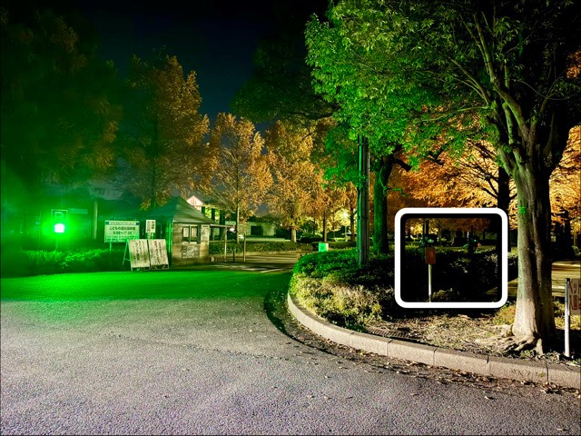 (2)の坂を登って駐車場エリアに入ってすぐの前辺りにあります。
