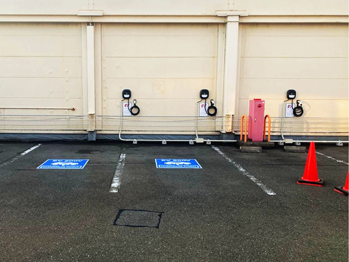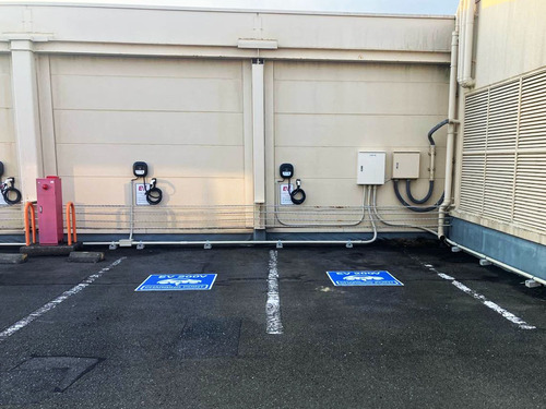 屋上駐車場に上がって左に曲がってからの右奥(北西側)、店舗で入り口の向こう側にあります。 充電器番号は右からは若い順です。