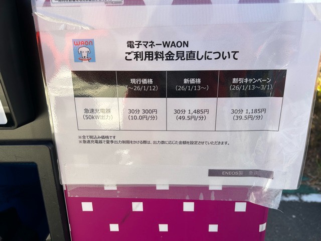 ★オフィシャルサイトより確認★ 2026/01/13(火)~2026/03/31(日)の間、イオンペイ・電子マネーWAON支払いの割引キャンペーン実施中 急速充電 10 分の場合100 円引き、急速充電 20 分の場合200 円引き、急速充電 30 分の場合300円引き