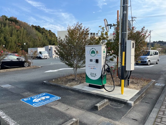 支払い方法が豊富でビジター充電に優しいです。平面駐車場入ってすぐ、左手にあります。