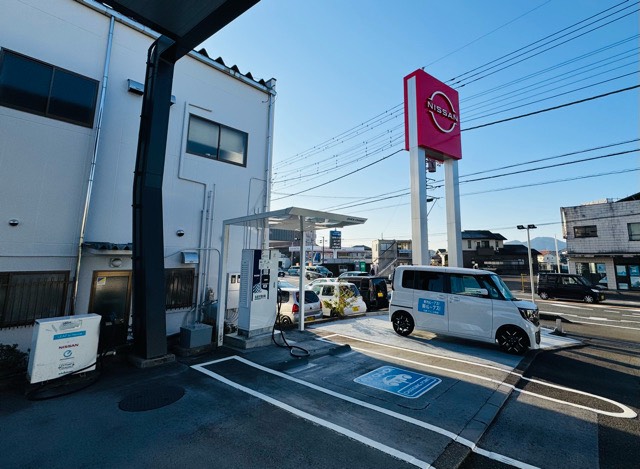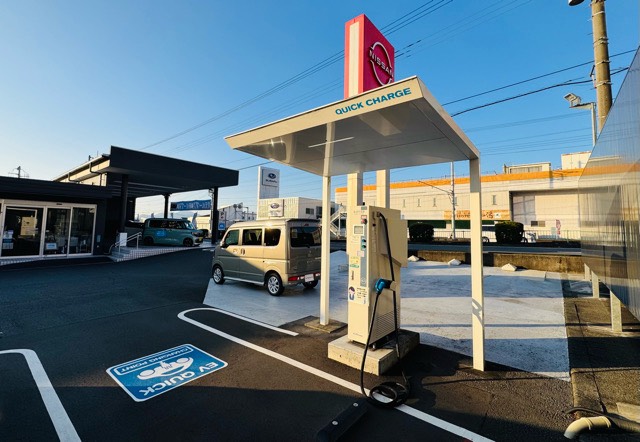 ニチコン製50kW器です。販社敷地入り、すぐ左手に設置されています。充電器下は屋根付きです。隣に静岡日産50kW器あるので充電ブッキングに対処可能ですね!