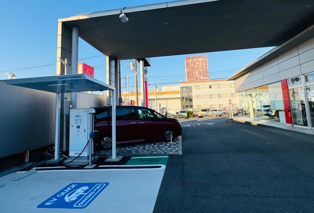 (株)東光高岳製50kW器です。販社敷地入り右手、ショールーム前に設置されてます。充電器には屋根ありです。隣にプリンス静岡50kW器あるので充電ブッキングに対処可能ですね!