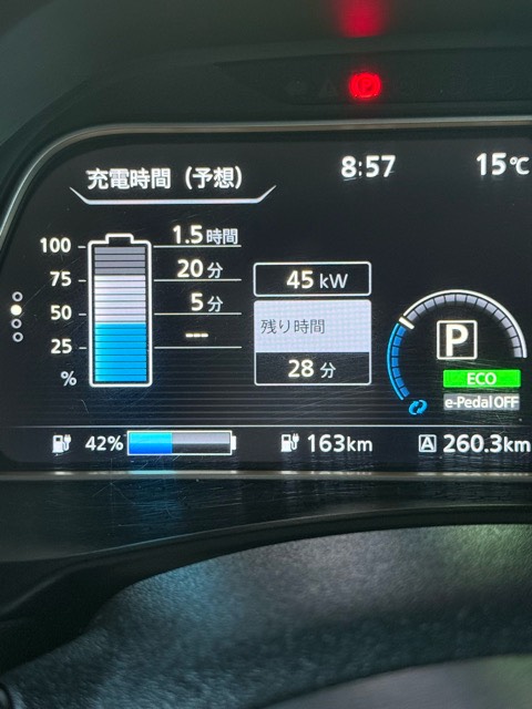 充電器は交差点から入った所なので出入りがちょっと大変ですが、新しい充電器使わせていただきました。48キロ出ました。
