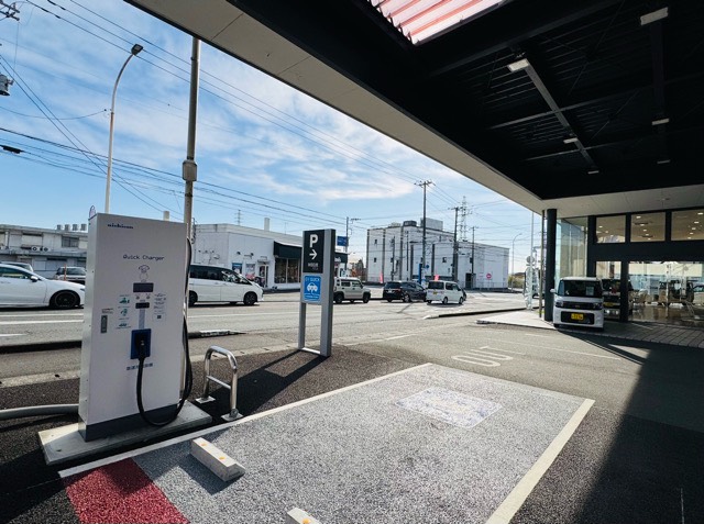 ニチコン製50kW器です。販社敷地入りすぐ右手に設置されてます。隣が静岡銀行なのでATM来たついでに充電出来ます。