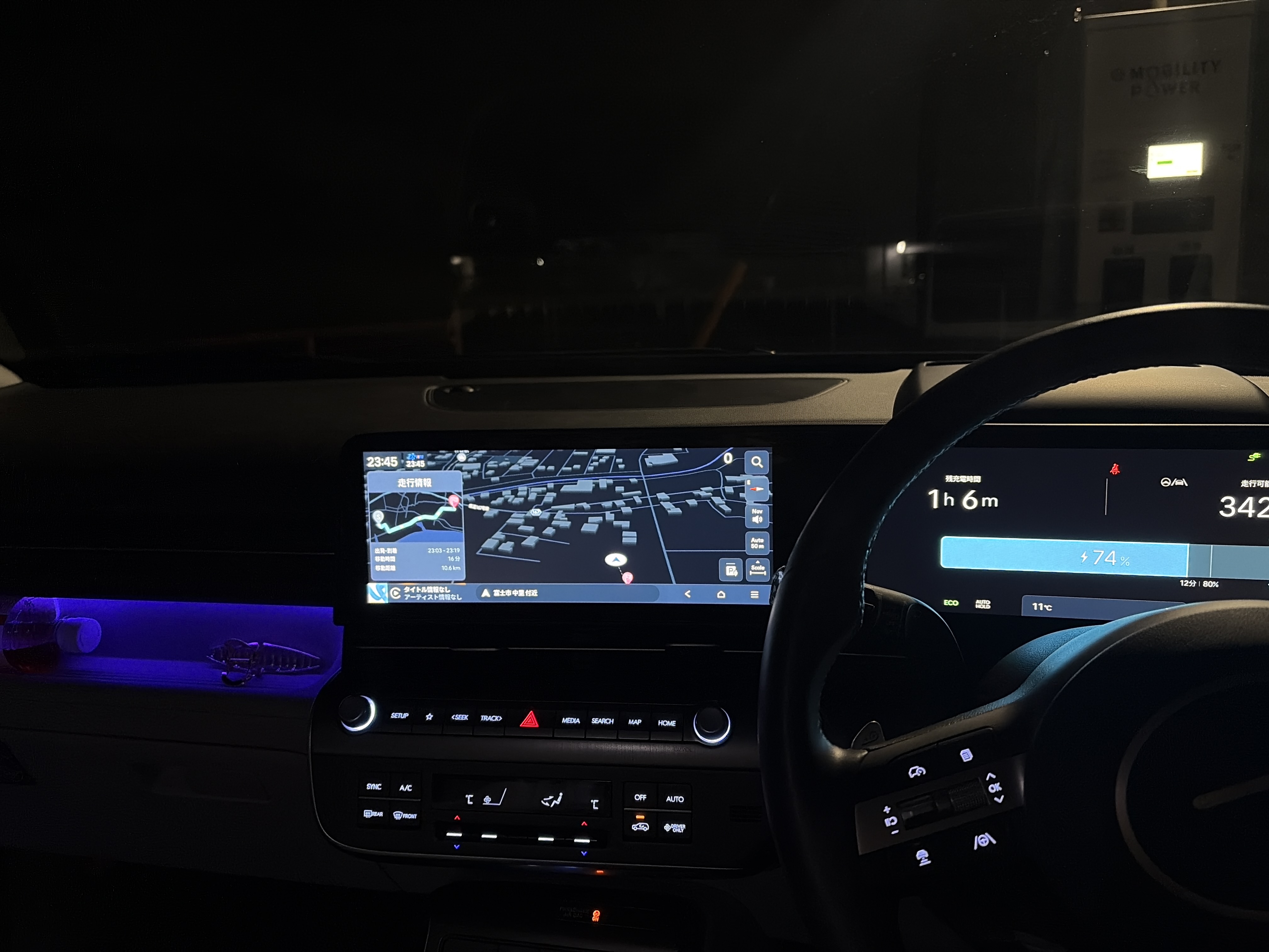 • 充電器は交差点から入った所なので出入りがちょっと大変ですが、新しい充電器使わせていただきました。48キロ出ました。