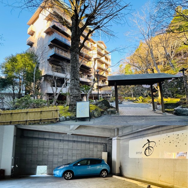 ENECHANGE認証 Zerovo Technologies製6kW充電器×2器です。ホテル敷地入り坂道を登り左手の駐車枠に設置されてます。ホテルエントランスは写真左手側手前です。