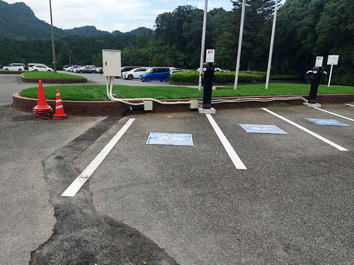一瞬迷いますが、立体駐車場1Fの出口付近にあります。 レストランと宿泊者は無料で利用可能だそうです。 時間制限は特に無いと伺いました。 ホンダ製3.0kW機が2台 ちなみに現在、認証等は特になしとのことです。