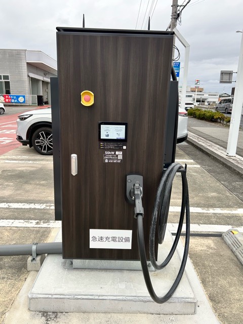ダイヘン製50kw急速充電器が整備工場前の駐車場に設置されていました。プラゴまたはHONDA chargeから55円/分から利用可能でe-Mobility Power系カード等は使えません。またビジターの場合はQRコードを読み取っても利用できます。N-ONE eの場合は、プラグを繋ぐだけで充電開始されるのは非常に便利ですね!