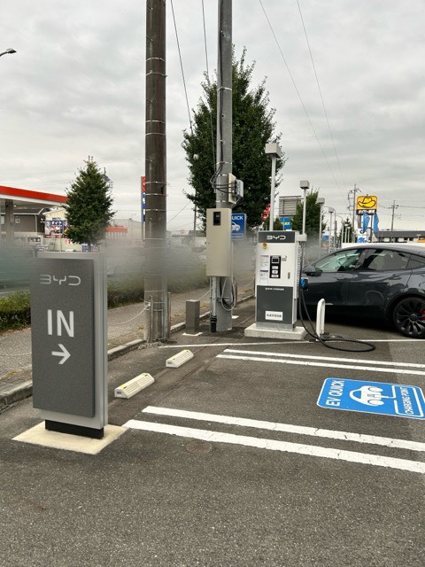 東光高岳製50kw急速充電器が店舗駐車場入口すぐそばに設置されていました。エコQ電認証から55円/分(BYD会員33円/分)から利用可能でe-Mobility Power系カード等は使用できません。営業時間内で使用できるようです。