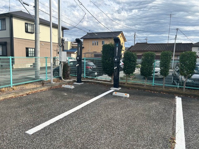 6kw普通充電器が2台、駐車場入口直進した南東角に設置されていました。DMM EV ONアプリからのみ利用可能なため、emp認証カード等からは利用できません。EV優先マークがないため、充電していない車が駐車している可能性もあるので、注意が必要です。