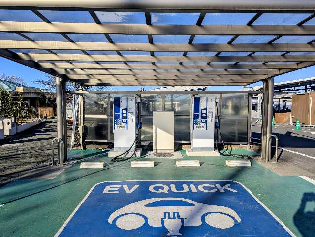 東光高丘製50kw急速充電器が2台設置されていました。屋根付きの場所で店舗入口付近に設置されていたので、便利に使用できました。すぐ近くには、6kwの普通充電器も6台設置されているので、滞在時間によって普通充電か急速充電かを変えられるのはよかったです。empカードまたはエコQ電認証から利用できます。