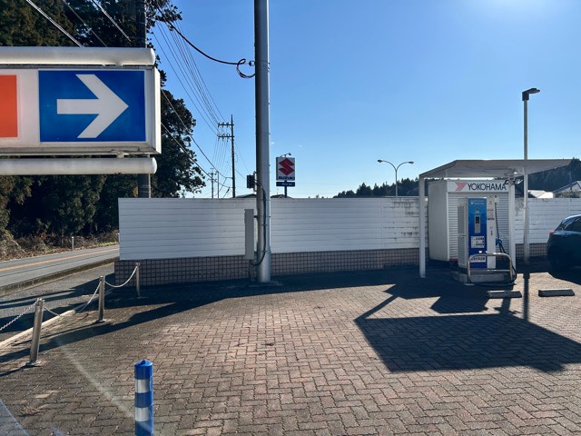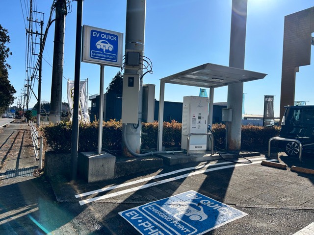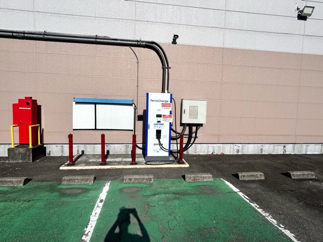 東光高岳製50kw急速充電器が駐車場入り口付近に設置されていました。新しい機械に更新されたようですが、転回スペースがあまりなく駐車は大変そうです。e-Mobility Power系カードまたエコQ電認証の場合は30円/分〜利用できます。店舗休業日でも使用できそうです。