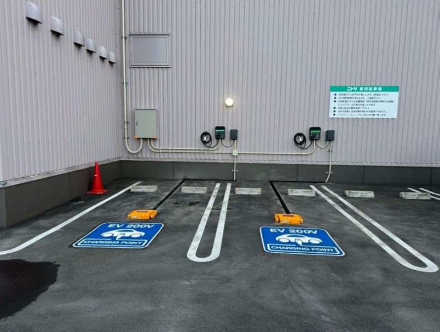 駐車場入って左側にあります。 店舗の自動ドアの向かいにあります。 普通充電器1台