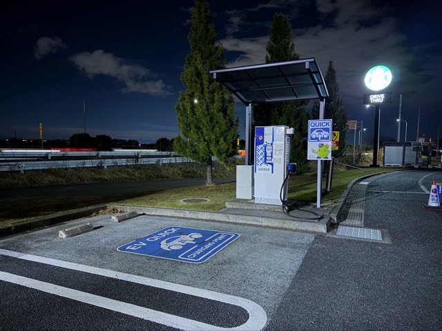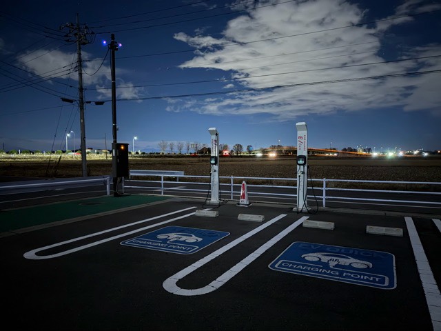 入って一番左側の奥ですね。週末の昼時で駐車場はかなり混んでましたが充電は待ちなしで出来ました。