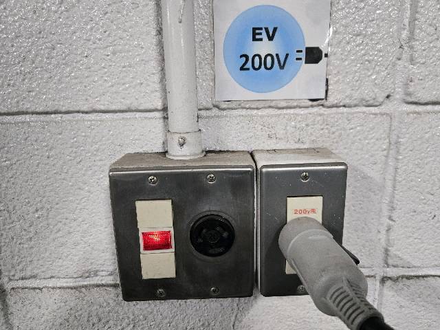 ケーブル持参必要です。リーフの標準ケーブルだと、バック駐車でギリギリ届く配置です。コンセントが微妙にゆるく、アースエラーが出やすいので注意です。 連続充電は8時間を目安にお願いしますとのことでした。