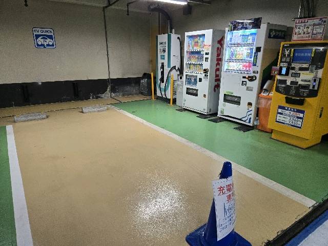 急速充電器も一台あります 普通充電の近くの料金精算の隣です コーンが立っていてあまり利用しているのを見たこと無いです。