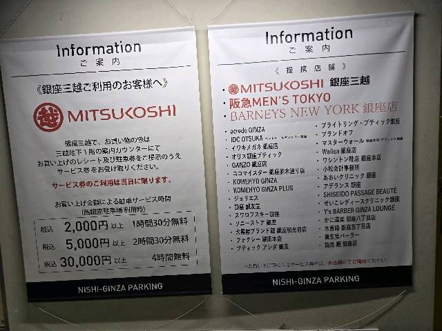 2024年3/23日 駐車場からのお知らせ 3/23(土)からは、急速充電器1台、新設6kW普通充電器6台、更新3kW普通充電器21台がご利用頂けます 地下二階の新橋駅寄り73から八丁目セレスティンホテル出口迄11台あります。 コーンが立っていますので、動かして利用します。コントローラーはG出口にあります。 一時間からフル迄選べます。 2024年3/25日 充電機械が新しくなりました 63から6台程6Kwの出力の機械でその後Anyca専用が並びその後3Kwの機械です。 コントローラーで3kwか6kwを選び1時間、3時間も選べます。 駐車料金 30分310円 12時間3,600円 三越で買い物2,000円で1時間30分5,000円で2時間30分サービス
