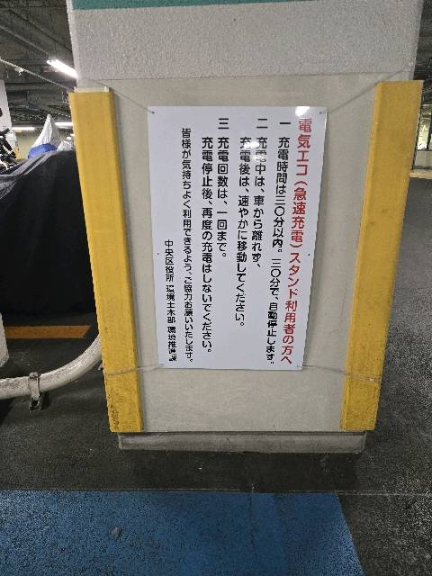 [急速充電器] 2023/09/27よりeMPスポットとして運用。 認証システム:eMP、エコQ電 【ビジター料金やeMP未加盟充電器の情報等】 駐車場管理室での手続き(要車検証)にて駐車1時間無料。 車種により、東京都及び東京都監理団体等の低公害・低燃費車に係る駐車場料金割引対象となる場合あり。