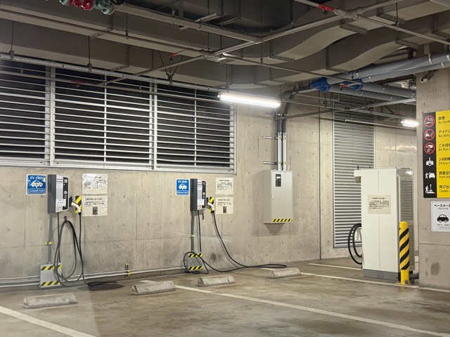 50kWと25kWの2基がおいてあります。50kWは自治体のEV充電有料化に伴って、使われる頻度が上がっているので、隙間を見ながら使う感じがいいと思います。