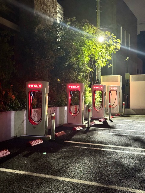 自宅の充電設備が一日使えなかったため 駒沢のスーパーチャージャーを初利用。 112kw・643km/hrで、10分弱1,117円 だけ75km分充電。