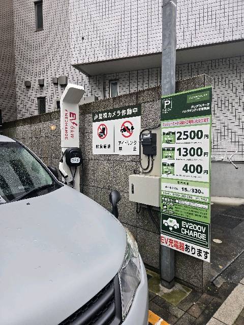 利用させていただきました。駐車マスは小さいですが、寄せればGG3W アウトランダーでも入庫できます。充電待ちは、地下駐車場前の来客用駐車スペースで一応できそうです(もちろん、ビル来客優先ですが)