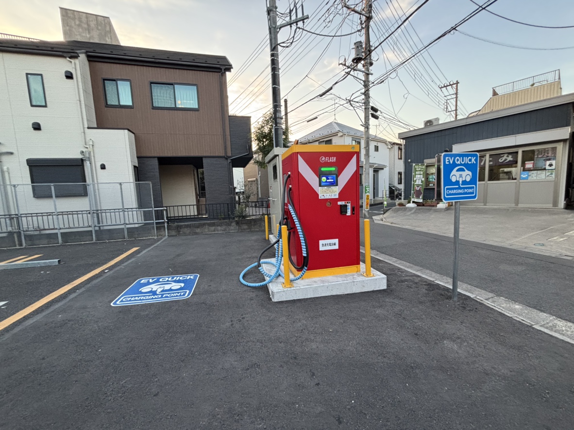 都営住宅の駐車場、奥の場所にあります。 CHAdeMOアダプターで46kWで入りました。