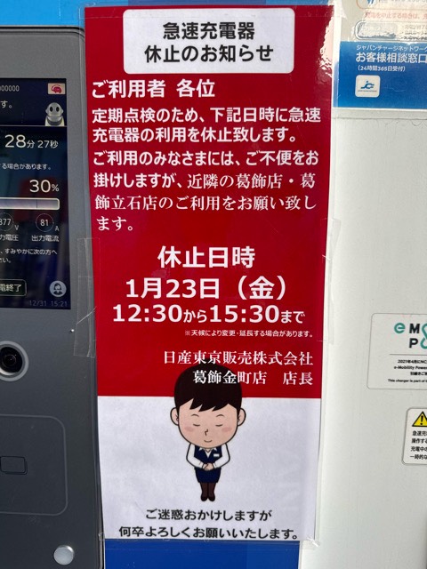 R6上り側の日産東京販売 葛飾金町店にあります急速充電器です。店舗広いです。