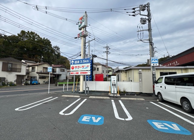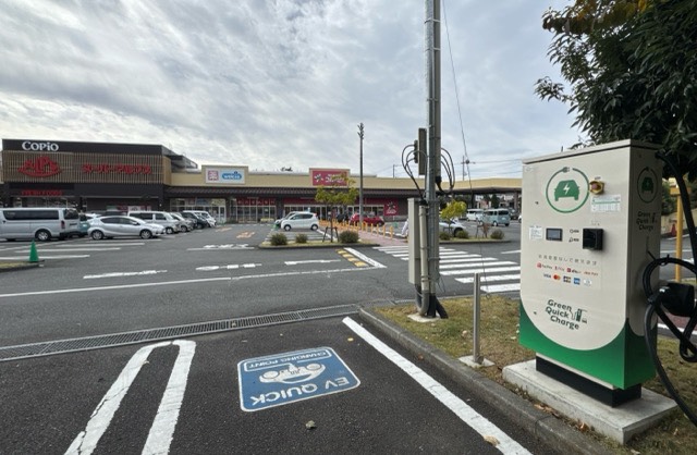 東光高岳製50kw機が国道16号線側の店舗入口そばに設置されていました。 営業時間外でも利用できるようです。 empカード、エコQ電で利用できます。エコQ電の場合は、1分30円と格安です。 EV Quickの看板が大きく遠くからも視認性がよかったです!