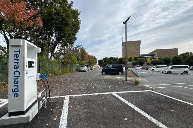 ガードレール沿いに並ぶ駐車スペースにEV充電器があります。 最大出力6kW