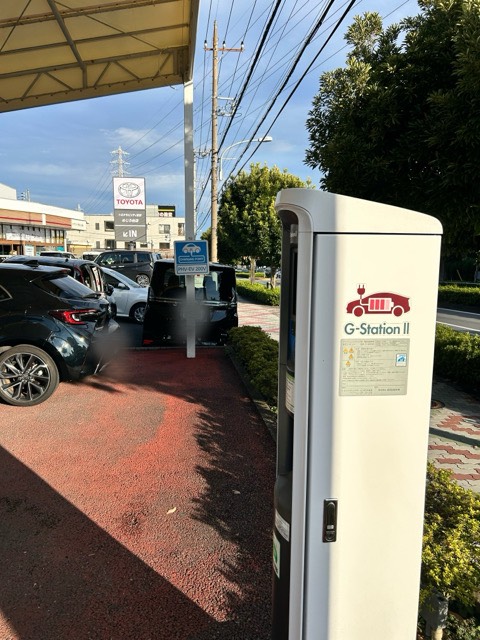豊田自動織機製3.2kw普通充電器が設置されていました。e-Mobility Power系カードから最大1時間まで営業時間内で使用可能です。また、使用の際はスタッフの方への声がけが必要です。(試乗車などが駐車している場合があるため)