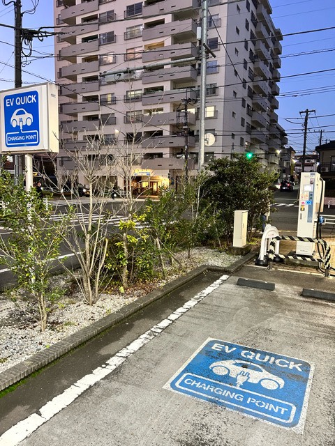ニチコン製50kW器です。販社敷地入りすぐ左手、イトーヨーカドー側に設置されてます。使用出来る時間帯は営業時間内との表記ですが、ポールで奥へ入れない様に区画され営業時間外でも使えそうです。