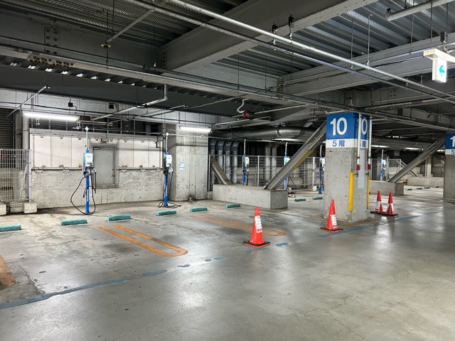 ZEROVA製6kw普通充電器が立体駐車場5階に11機設置されていました。7台は東側エレベーターホール付近に、4台は西側エレベーターホール付近に、設置されていました。e-Mobility Power系カード、ENEOS charge Plusから利用できます。なお、ENEOS charge Plusと電子マネー決済以外は3kw出力しか選べません。