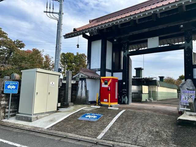 CHAdeMO&NACS規格対応最大出力240kw急速充電器がお寺入り口に設置されていました。e-Mobility Power系カードなどでは使えず、クレジットカード or QRコード決済から44円/kwhで利用できます。従来課金制で充電できるのはいいですね!ただ、駐車枠が傾斜になっているため、最低地上高が低い車は擦ってしまう可能性があるため注意が必要です。また、周辺の道路も狭かったです。