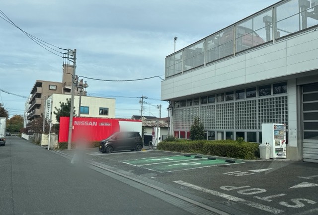 万葉けやき通り沿いの日産東京販売 八王子東浅川店に設置されてます急速充電器です。店舗沿いの路地を入り敷地奥に設置されてます。