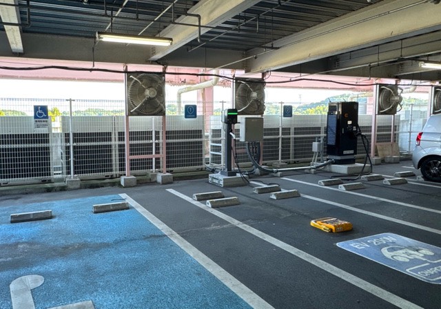プラゴ認証の①モリテックスチール(株)製6kWと②DAIHEN Corporation 製50kw器です。スロープを登り3階奥『3B』エリアに設置されてます。事前にプラゴ入会しておけば、1時間予約出来ます。(但し、予約して使わないとキャンセル料取られます)駐車場は無料です。