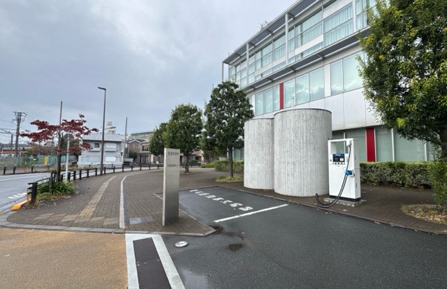 • ニチコン製50kW充電器です。頭から入れても転回スペース十分にあります。