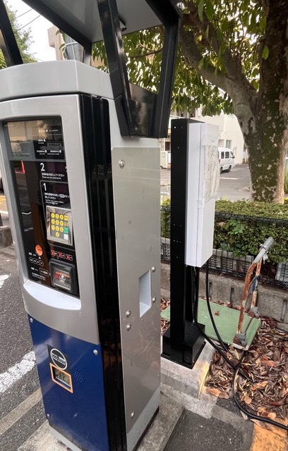 日東工業(株) 製(販売:(株)豊田自動織機製)3.2kW器です。駐車場前の通りは狭い一方通行路です。また花小金井駅近くなので人通りも多いので出入りは要注意です。600円で満充電に出来るのは羨ましいです。
