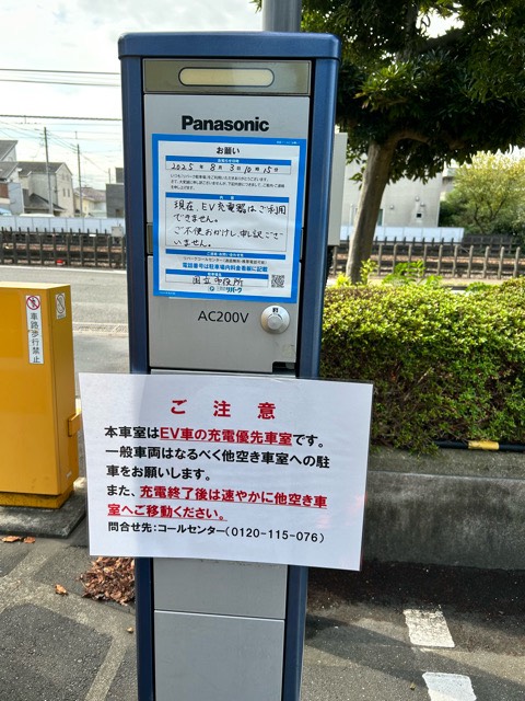 駐車場入り口一番左側にPanasonic製のコンセントが設置されておりました。しかし、9月27日時点で8月3日よりご利用できませんとの張り紙が貼られておりましたので、利用できないようです。