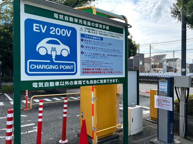 駐車場入り口一番左側にPanasonic製のコンセントが設置されておりました。しかし、9月27日時点で8月3日よりご利用できませんとの張り紙が貼られておりましたので、利用できないようです。